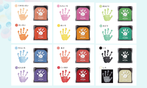 カラーはピンク、ブルー、イエローなど全19色。いつまでも色褪せしないキレイなカラー”手形・足型”が簡単に採取できます。(下は一部)